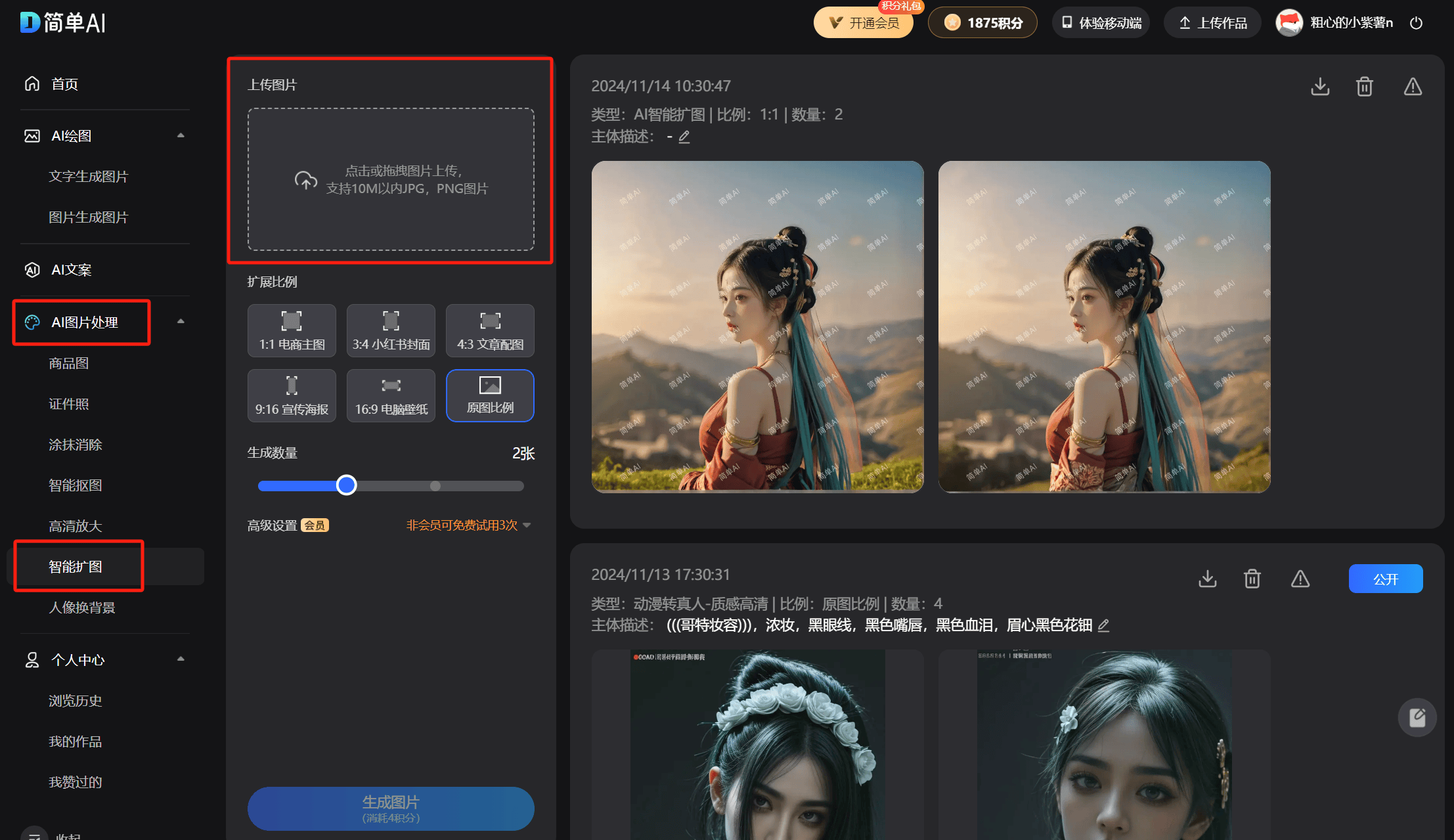 一女子身着卡其色外衣摄影,更有照片正在颠末 AI 扩图后呈现了不成描述的内容,选择左侧栏【AI图片处置】中的【智能扩图】,近日,调整参数(可选项)正在这里我保举一个很是好用的东西——简单AI(),AI 扩图火出圈!你能够调整【扩图比例】和【生成数量】,它就能阐扬本人的想象力,它是搜狐推出的AI产物,正在抖音“AI 扩图” 线 亿次播放量,让AI填充布景正在线网坐一键生成。通过 AI 扩图能够扩大场景范畴,有人暗示 “了我的废片”,而且还能连结其清晰度,提及 AI 扩图这件事,